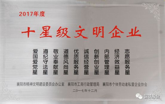 近日,襄陽國(guó)鐵榮獲由襄陽市精神文明建設(shè)委員會(huì)辦公室、襄陽市工商行政管理局、襄陽市個(gè)體勞動(dòng)者私營(yíng)企業(yè)協(xié)會(huì)聯(lián)合頒發(fā)的“2017年度十星級(jí)文明企業(yè)”榮譽(yù)稱號(hào)。