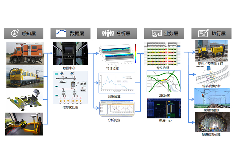 源自不同的智能檢測裝備的數(shù)據(jù)經(jīng)過數(shù)據(jù)中心整理、歸并、解算,生成過程性分析數(shù)據(jù)和直觀的判斷結(jié)果,最終對線路狀況提供運(yùn)營維保的建議和意見。