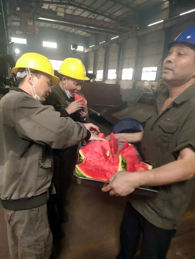 在車(chē)間緊張的生產(chǎn)中,行政處工作人員為在高溫下堅(jiān)守崗位的員工送上清涼的“能量補(bǔ)給”,不僅清熱解暑,還承載著公司領(lǐng)導(dǎo)對(duì)員工的感謝與關(guān)愛(ài)。