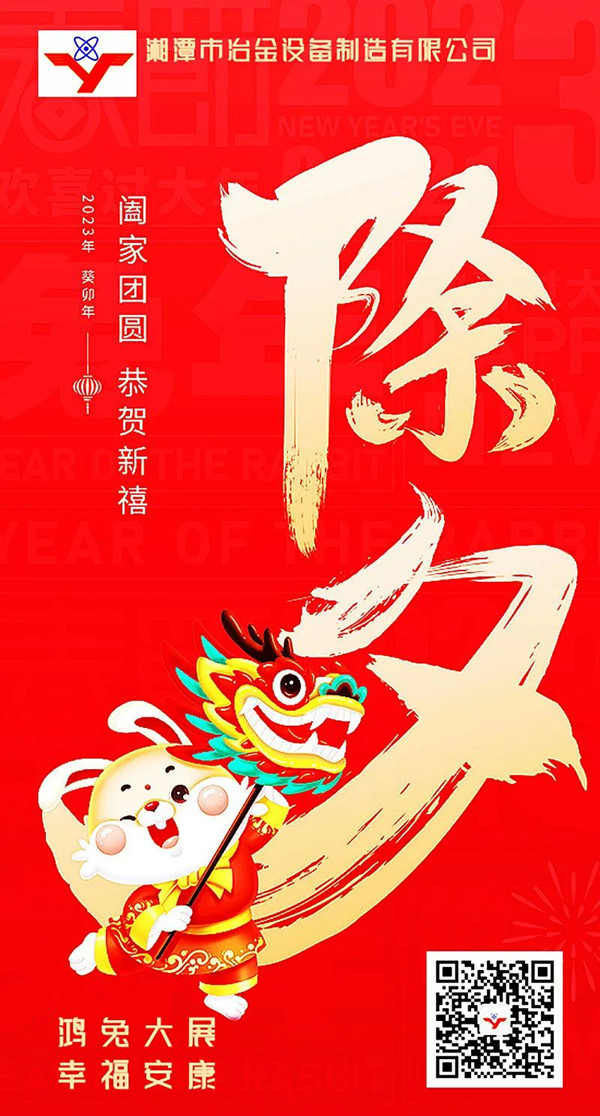 ”爆竹聲聲一歲除,歡天喜地迎新春“。在震天的鞭炮聲中,在滿天璀璨的煙花里,我們與2022揮手告別,與嶄新的2023年深情相擁……陪伴是最深情的告白,相守是最溫暖的承諾。除夕之夜,最大的幸福莫過(guò)于和家人團(tuán)聚,最大的快樂(lè)莫過(guò)于陪父母長(zhǎng)輩談心,最好的祝福就從湘潭市冶金設(shè)備這里傳遞……值此農(nóng)歷除夕到來(lái)之際,國(guó)內(nèi)冶金礦山設(shè)備非標(biāo)定制專家——湘潭市冶金設(shè)備制造有限公司衷心祝愿所有客戶、伙伴、朋友、家人們:除夕團(tuán)圓! 新年歡喜!鴻兔大展! 萬(wàn)事如意!祝天下所有父母:健康長(zhǎng)壽,平平安安!祝天下所有家庭:溫馨和睦,幸福美滿!