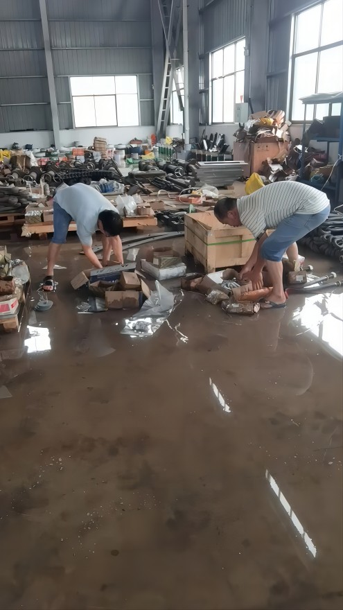 黨員張忠是在清晨六點多就奔赴車間前線,指揮員工譚正武迅速吊起8米立車,并與門衛(wèi)值班人員黃永輝一起搶救倉庫物資。7點后,干部們冒雨陸續(xù)趕往車間搬運物資,加固設備,確保生產(chǎn)線關鍵節(jié)點的安全。盡管衣服濕透,汗水混著雨水滴落,卻不敢有絲毫松懈,隨時備戰(zhàn)應急響應。